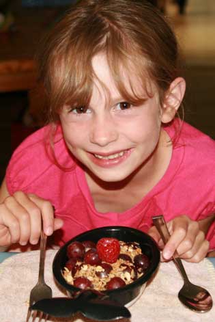 Next came grapes, and then a single raspberry as a garnish. Grace smiled as she worked, and at one point she exclaimed, “I can’t believe I’m cooking!” It was priceless. Of course, she ate the entire concoction, and excitedly recounted the entire “cooking” process to her dad when he arrived home.