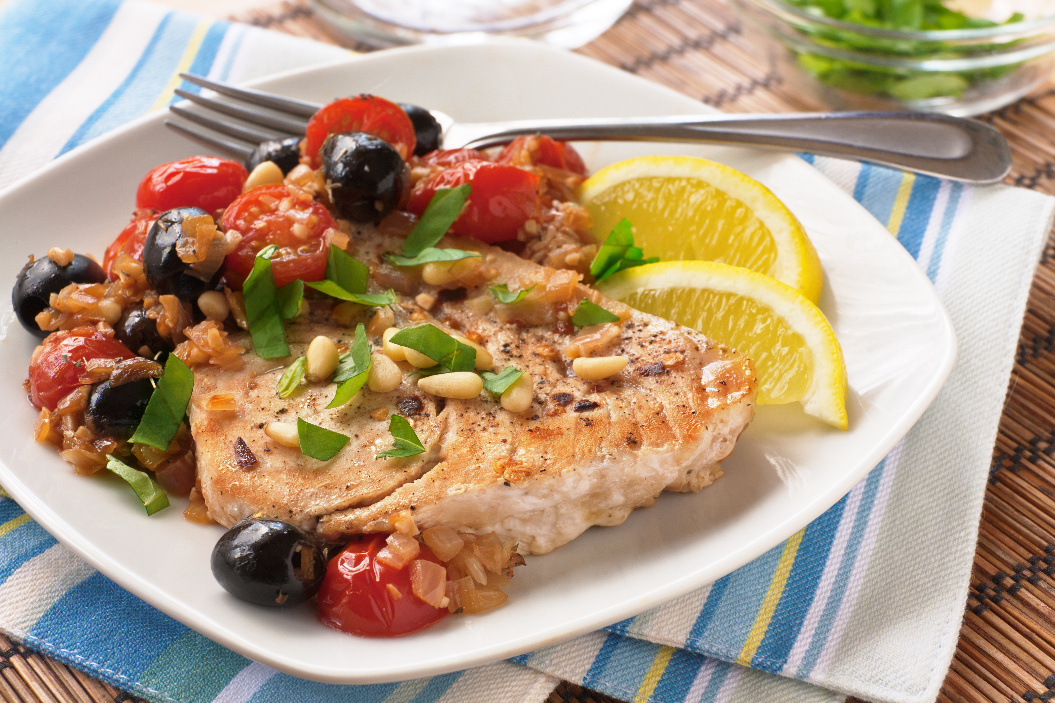 3 Guiding StarsSwordfish has never tasted better than in this simple dish. Olives and tomatoes bring in excellent flavor. For a cheaper alternative to pine nuts, try walnuts. (3 Guiding Stars)